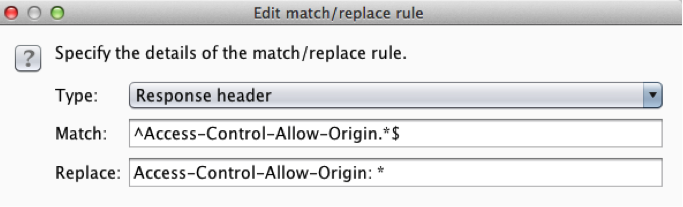 browser, then the restriction can be circumvented. For instance, with Burp, you can setup automatic match/replace values using regular expressions. This can be found under the Proxy tab, and then under the Options sub-tab, then scroll down to Match and Replace. Replacing the value for the Access-Control-Allow-Origin header with an “*” will tell the browser that cross-site HTTP requests are permitted from any domain, thus any resource data sent to the browser will be accepted.