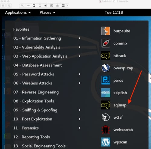 While we won’t go into how to set up Kali or Samurai WTF, within Kali you will find SQLMap under both the ‘Web Application Analysis’ section as well as the ‘Database Assessment’ section.