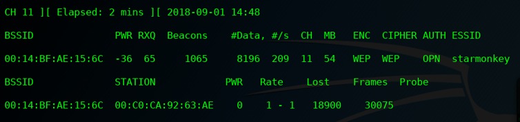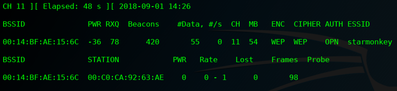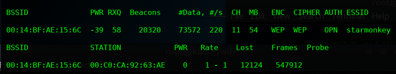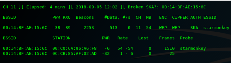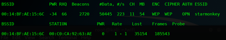 - airodump-ng -c 11 –bssid 00:14:BF:AE:15:6C -w example1 wlan0