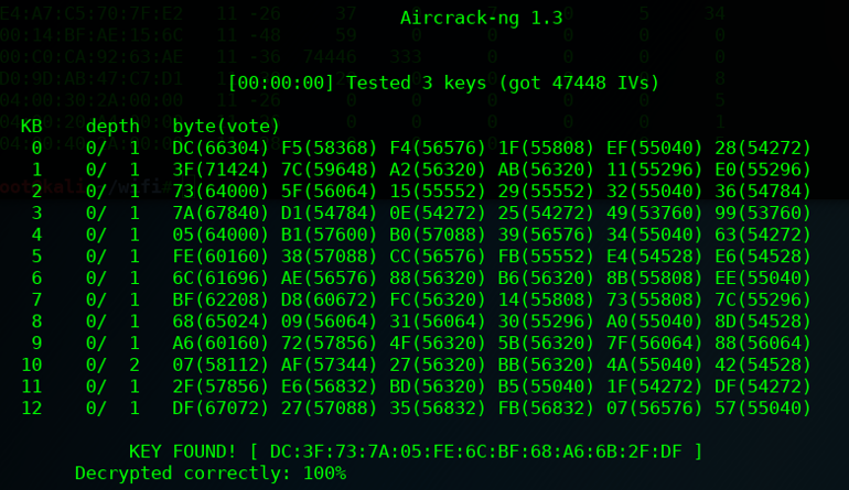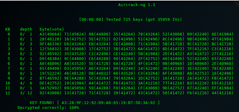 With just over 70k #Data packets captured, we’re able to crack the key: