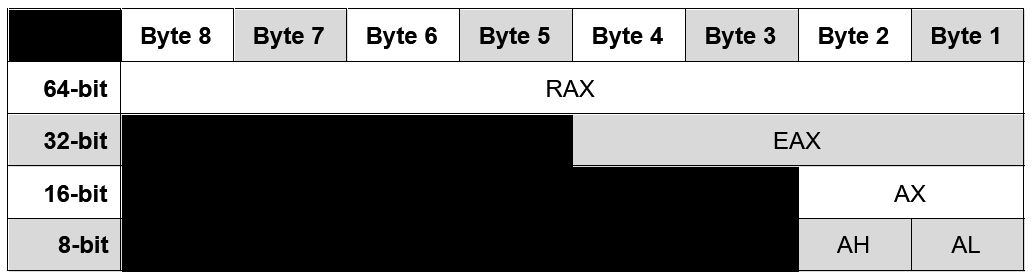 Accumulator | RAX | EAX | AX | AH | AL |